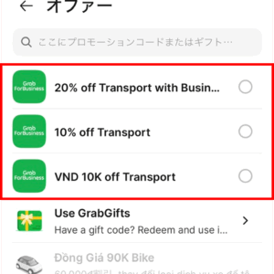 ※これはGrabのアプリ画面です。Grabではオファーボタン、Green SMではプロモーションボタンを押すと、その時に適用できる割引が出てきます。ちなみに何が一番安くなるかがわからない時は、一回選択してから金額がいくらになっているかを確認してみると良いですよ!